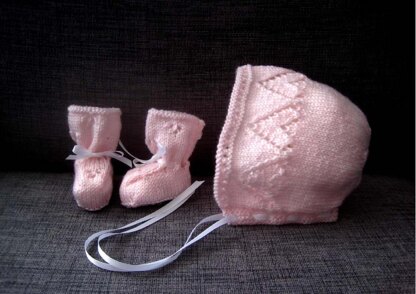 - A gorgeous traditional style bonnet and matching booties set featuring a super cute love heart lace motif.