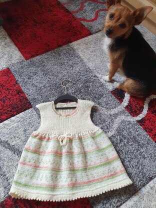 The dress is made bottom up flat in two pieces and later sewn together. The stockinette part can be made in the round too, instructions are provided in the pattern.