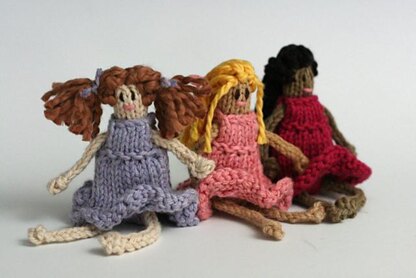 Fiddly, fast and fun, Sweeties are a great way to use up your worsted scraps (the largest amount needed is for the dress, about 16 yards) and say "I love you enough to immortalize you in yarn" all at the same time. When knit to gauge, they are 5.5" from bald head to bobble toe. The possibilities are limited only by the colors of your scrap yarn.