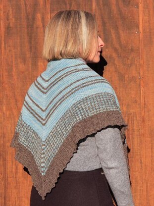 Knit from a heavy DK/light worsted weight yarn, this shawl combines a simple striped stockinette panel, an easy-to-work slip-stitch tweed pattern and a simple ruffled edging. The original shawl was knit using sky blue (main color - 250 yards) and natural brown (contrast color - 275 yards) yak/cormo yarn from Bijou Basin. A possible substitute yarn would be Cascade 220, but be sure to swatch first to determine that your gauge is appropriate.
