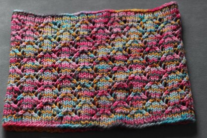 Cowl is knitted in the round, and pattern is both written and charted.