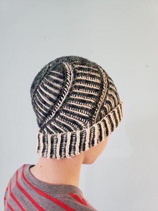 This reversible hat is a great way to learn brioche knitting! The brim starts off with a two-color brioche rib in the round, and then simple decreases and increases are added for the “swirl” of the body of the hat. Designed to fit as a watch-cap/toque style, the brim can easily be made longer. Written for three sizes, from baby to adult.