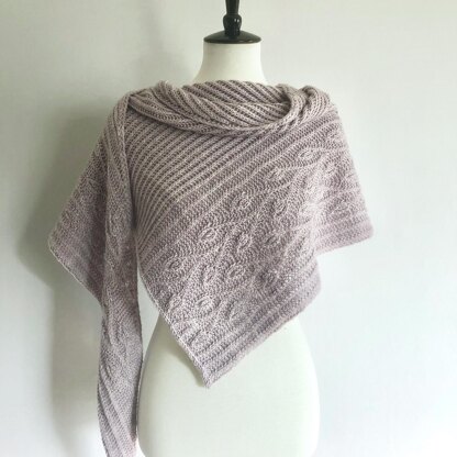 The Sylvan Paths Shawl is an asymmetrical triangle-shaped shawl worked from the bottom corner to the top edge. The beautiful leaf motif is worked in one-color brioche and one-color garter stitch.
