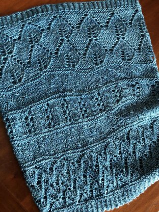 This sampler-style cowl is knit in the round from the top to bottom opening. It features a fun-to-knit selection of lace and textured patterns representing aspects of the beech tree and its leaves.