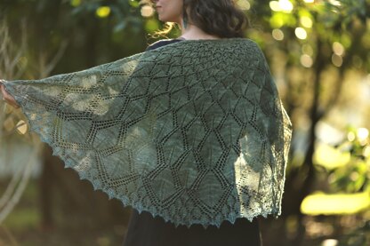 Sylvatica is relaxing semicircular shawl of expanding leaf lace with a hint of texture to give it depth. The design begins with a central flower then flows into a series of expanding leaves, gradually opening into the tracery of winter branches, before returning to the new leaves of spring.