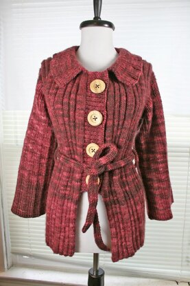 This snuggly knitted coat utilizes a unique pattern of ribbing that mimics the short-longshort pattern of a syncopated jazz beat. Knit seamlessly for minimal finishing. Pictured with approximately 5” of negative ease.