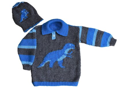The sweater features a dinosaur (Tryrannosaurus) on the front and has contrast striped sleeves. The hat also has a T Rex and matching stripes.