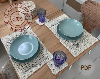 In this pattern I used Jute with a yardage of 70-75 m/50 g. The finished placemats are ca. 30x45 cm and coasters are ca. 10x12 cm.