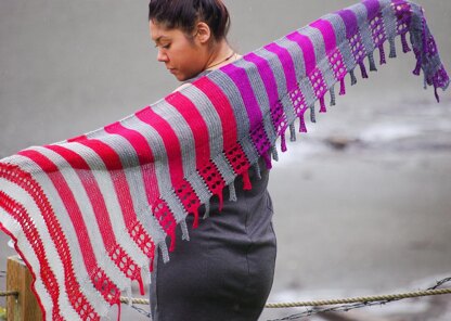 Worked from narrow end to wide end this fun shawl is mostly garter stitch with alternating gradient colors. The border is worked at the same time as the garter stitch section and features double yarnovers and wrapped stitches with a wide fringed edge.