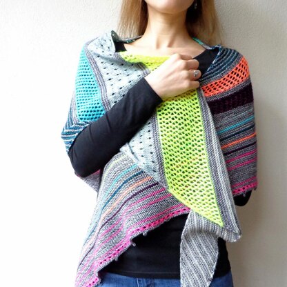 This colourful shawl is playing with colours and stripes. It is combining garter stitch with some easy lace and will be perfect for your mini skeins or using up your leftovers!