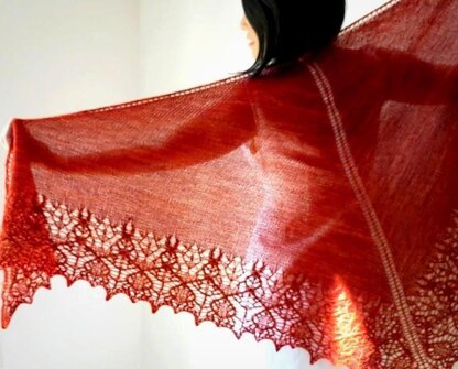 A triangular shawl. Knit from top-down with cables and lace border. Lace stitches worked on RS only, simply purl all stitches on WS rows.