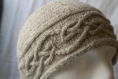 This close fitting hat features a cabled band inspired by an unusual piece of Celtic knotwork, which appears to be a continuous line but is in fact a series of interlinked loops.