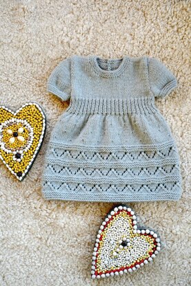 Introducing the Talulla Dress - a timeless pattern with its beautiful lace edge detailing and rib waist, this dress is knitted with Vespers 8ply merino Smokey Blue and features a crew neck, short sleeves and buttoned centre back.