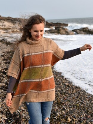 This comfortable oversized poncho is knitted bottom up on straight needles or circular needles. The design features are dropped shoulder, long turtle neck collar knitted in textured ribbing and comfortable oversized silhouette.