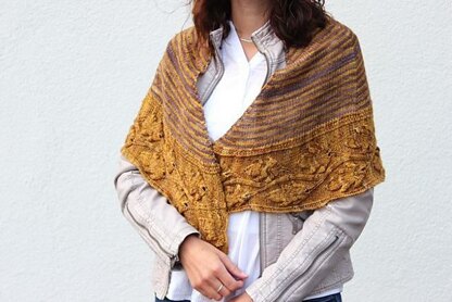 Tammea is a semi-circular shawl, with stripes and leaves on the border The stripes section is knitted first and the knitted-on border is attached at right angles to the body Charts and written instructions. The pattern is available in two sizes. The yellow/brown shawl is the small size and the natural/red shawl is the large size.