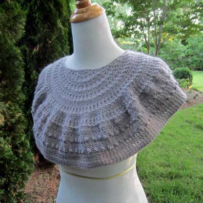 Tamsin is best described as a cowl hybrid. It is a crocheted piece you slip over your head, and it hugs your shoulders in the back and drapes across your chest to show off your pretty stitches. It is initially worked in rows as a crescent and then joined on the sides so that it can be finished in the round. Wear Tamsin over a top or tee to dress up your look.
