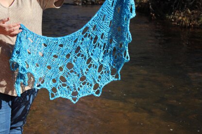 Tamsin Wood is a timeless curved triangle shawl with leaf lace down the center and edges. The pattern is written and charted out.