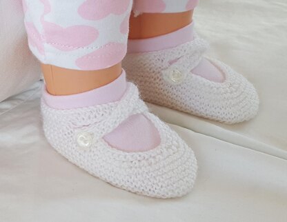 These 3ply garter stitch baby shoes have two ankle straps that are crossed and buttoned. This style of shoe is also available in 4ply and 8ply.