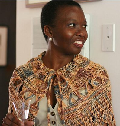 The culturally traditional cape takes on modern wearability in this innovative, yet easily executed, design. Begin with an edging that uses Elizabeth’s Lace Lattice from “On the Edge” by Nicky Epstein. After binding off, you’ll pick up stitches along the straight edge and then create a strikingly graphic design by dropping and crossing stitches. Fasten with an i-cord drawstring woven through an eyelet row for a cape full of artistic energy.
