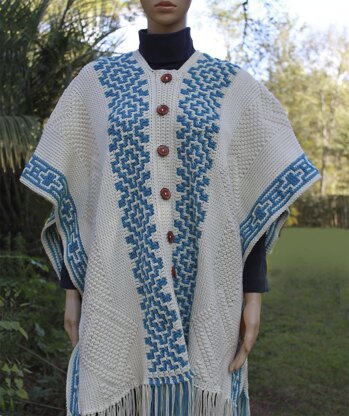 Poncho Materials: Size G crochet hook or size needed for gauge; worsted weight cotton—35 oz. ivory, 9 oz. dark turquoise; 8 one-inch buttons. Gauge: 4 sts and 4 sc rows = 1". Size: One size fits most.