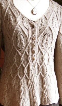 Hopelessly romantic! Lavishly cabled cardigan with natural shaping incorporated into the stitch pattern, lace details on bodice and a sweetheart neckline. Sweater body is knit from the bottom in 1 piece to underarms, then worked as 2 fronts and back. Front cable borders with knit-in buttonholes continue as a narrow band around the neckline.