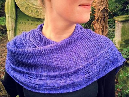 Following on the heels of the hugely popular [T.A.R.D.I.Socks][1], this double shawl pattern features the famous Blue Box motif as a border to two sideways-knit crescents. The motif retains its distinct shaping and cable vortex but has been simplified to make this a moderately easy knit. Two lengths gives the option to wear as a draped shawlette or a wrap-around shawl and two different fibre content yarns are suggested to give even more options. Pattern is charted with written explanation.