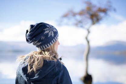 Colourwork goes graphic in this bold hat. Double knitting offers a fresh take on a traditional pattern: since there are no floats to manage, the motifs can be considerably larger, while a double layer of wool offers extra warmth for cold climates. With an innovative construction, knitted seamlessly from a provisional cast-on, Tarradale is fully reversible. A neat swirl crown finishes this hat off to perfection.