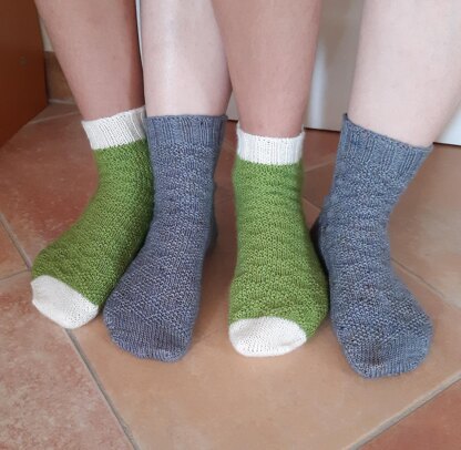 They are worked from toes up. You can make them bicoloured or single-coloured. You have the choice between two heel options too : an after-thought heel, or a heel with gusset and heel-flap.