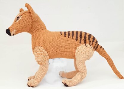 The Thylacine (Thylacinus cynocephalus: dog-headed pouched-dog) is a large carnivorous marsupial now believed to be extinct. It is also known as the Tasmanian Tiger. Some people swear they have seen them, but we are still waiting for definitive proof of its continued existence. Knitting a toy Tassie Tiger won't bring them back from extinction, but it's the next best thing, if you love them. This is a flat knit pattern, using DK weight wool yarn and 3 mm knitting needles. Size: About 30 cm ( 12") tall and 58 cm ( 23") long