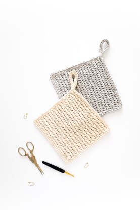 Learn how to crochet herringbone pot holders! The Tassa Hot Pads are modern, stylish and so easy to make. These simple pot holders feature a chevron stitch texture, single crochet border and a handy loop so you can hang the pot holders anywhere. This is a beginner-friendly crochet pattern is worked entirely in one piece and makes a great house-warming or Christmas gift!