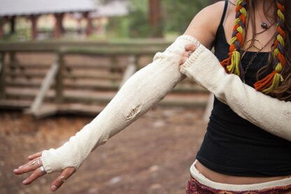 Each mitt has a different pattern, but you can wear them on either arm! They are knit in the round from the elbow to the wrist with a small thumb opening.