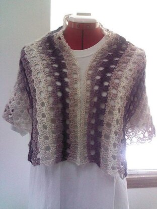 It is a top-down, asymmetrical, one-piece shawl. You can customise into a bigger size either by using a bigger hook or doing more repeats. This pattern will work with any kind of yarn and colours. Gauge is not important.
