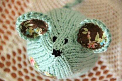 The Tea Mouse has darling little ears, with a fabric lining, a matching love heart on her front, and even a little knitted tail. She’s a sweet little character with a lovely black nose, which she just loves to point in the air. The Tea Mouse is a delight to look at and to create.