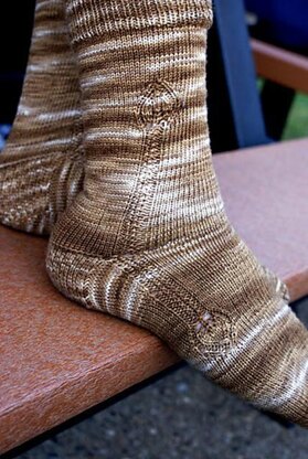From the pattern description: "The foot of these socks is knit first from heel to toe, then the leg is picked up and knit up to the cuff. This allows you to use every inch of a favorite yarn, while using a top-down foot fitting. The two tea leaf “hands” of the clocks on the leg and foot sit at about 4 o'clock on one side, and 8 o'clock on the other – perfect times for tea." Designed for a friend who likes tea very much.