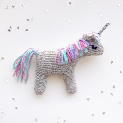 Yarn: DK or worsted weight held single, OR fingering weight held double (body: 25yds / 23m). Any other yarn weight could be used as well. The body of the unicorn is knit flat in one piece. Ears and horn are knit separately and seamed to the head. The mane and the tail are attached with a crochet hook. This unicorn has only two legs. The pattern includes short notes on how to use it to knit a horse, a zebra, or a donkey.