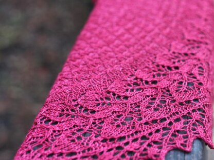 Teasdale is started with red leafy border worked in one long piece and is worked up in the "Killjoy" colorway dyed up by Stitches 'N Rows. Stitches are picked up to work the patterned body. Teasdale is available in charted format only.