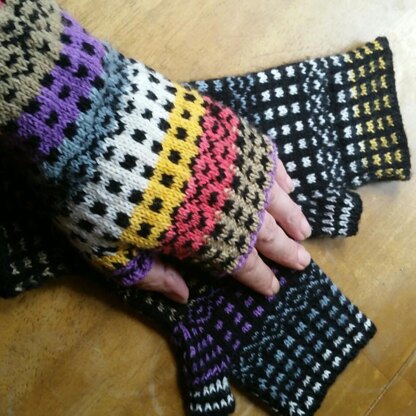 Samples used 1 skein of Knit Picks Felici and 1 skein of Knit Picks Stroll to make 2 pairs of mitts by reversing the main and contrast colors.