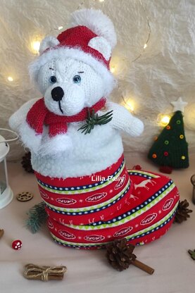 This detailed knitting pattern will guide you step-by-step to create an adorable 22 cm (8.66″) Christmas teddy bear made from soft white angora yarn. The bear features beautiful blue eyes, a cosy red Santa hat with fluffy trim, and a matching scarf. Elegant cable details are knitted on the lower paws, body, and head for a charming textured finish.