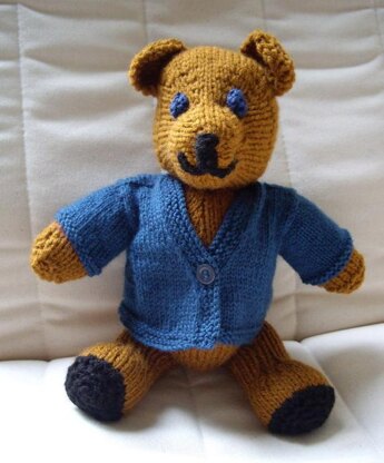 I work in a school and the Reception class teacher was having a problem with some very new little ones. They were frightened on their first day, so Teddy went in to cheer them up. He was new too so he helped the children settle down. He's soft and cuddly and just right for small children with no sharp edges or attachments. Everything is knitted, even the eyes.