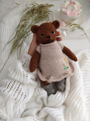 About the pattern: teddy bear in a dress with socks Knitting method: the toy is knitted "round " 1 PDF file with the detailed instructions (22 pages) 67 detailed step-by-step photographs Skill Level - Intermediate Skills required: Cast on/Cast off/ Knit/ Purl/ Increase/ Decrease