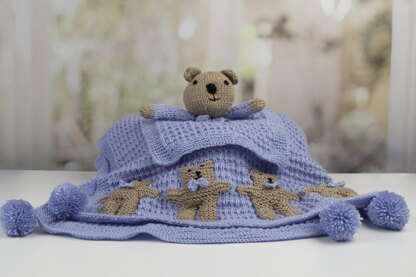 New born baby set includes a blanket and matching comforter. It has cute little aplique teddies along the bottom of the blanket.