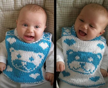 This bib works up fairly quickly, for a double knitting project. It’s reversible, so you can flip it for the next feeding if the first side gets food on it. It’s double-thick, so it’s extra-absorbent. It fits on over baby’s head, so it’s hard for wee ones to take it off themselves. And of course, it’s very cute.