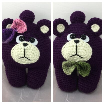 You will need the following to complete your project: Loops and Threads Charisma : dark purple (160 grams) Loops and Threads Charisma : bouquet (small amount) Loops and Threads Cozy Wool : black (small amount) 1 pair of 21 mm black safety eyes 18 mm safety triangular black nose White felt (small amount) 6.5 mm crochet hook polyester stuffing tapestry needle stitch marker straight t-pins - used to hold your pieces together while