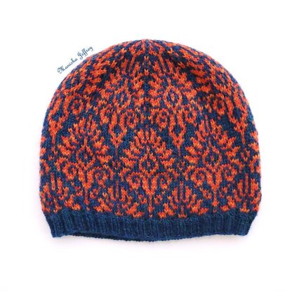 Tejas is a stranded colourwork beanie made with fingering weight/4 ply yarn. It uses 3 colours with the main colour being used throughout the knitting process and the contrast colours being used alternately. You can go up a needle size or down a needle size to fit your preferred head circumference.