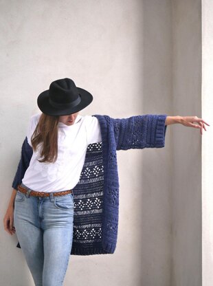 The Telavi Cardigan came as the idea of blending the light and airy with the soft and cozy. The broomstick lace gives the feeling of see-through-ness while the loosely spun wool gives you a warm hug.