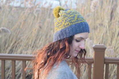 Slip-stitch dots and dashes form a cable illusion in the cozy Telegraph cap (or slouch). The colorwork pattern is the same one used in the Endpapers cardigan. You can practice on the hat, and then “graduate” to the cardi!