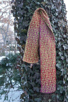 This scarf uses a chart I’ve been playing with and refining for some time, and had a scarf worked on the bias in the works when my home burned down in 2020. I was never really happy with the way it was coming out on the bias, so I decided to revisit the pattern as a standard double-knit one here.