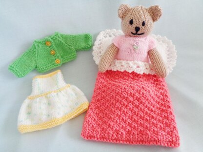 The dress, cardigan and nightdress which are removable are knitted in 4ply yarn on 3mm needles.