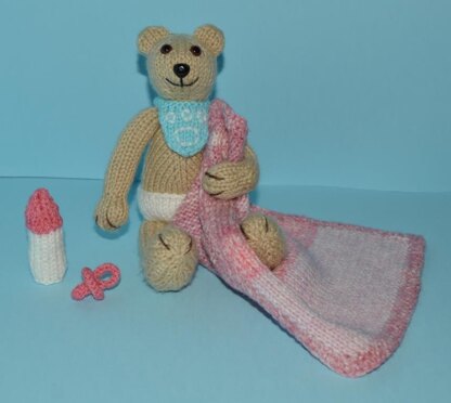 This pattern includes Tessa The Teddy, nappy, bib, pacifier, bottle, and blanket