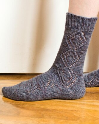 These socks are worked from the toe up, with slip-stitch detailing in the sole and German short-row heel for durability. Instructions are given for using the magic loop method on circular needles. The foot and leg length are customisable. The sample pair shown used a full 100 g skein of yarn in Size 2 with a total foot length of 25 cm / 9.75” and a total leg length of 25 cm / 9.75”.